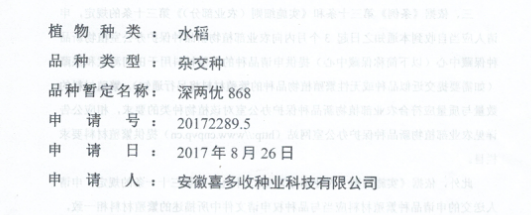 深兩優(yōu)868品種權(quán)申請受理通知書