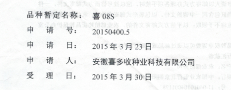 喜08S品種權(quán)申請受理通知書